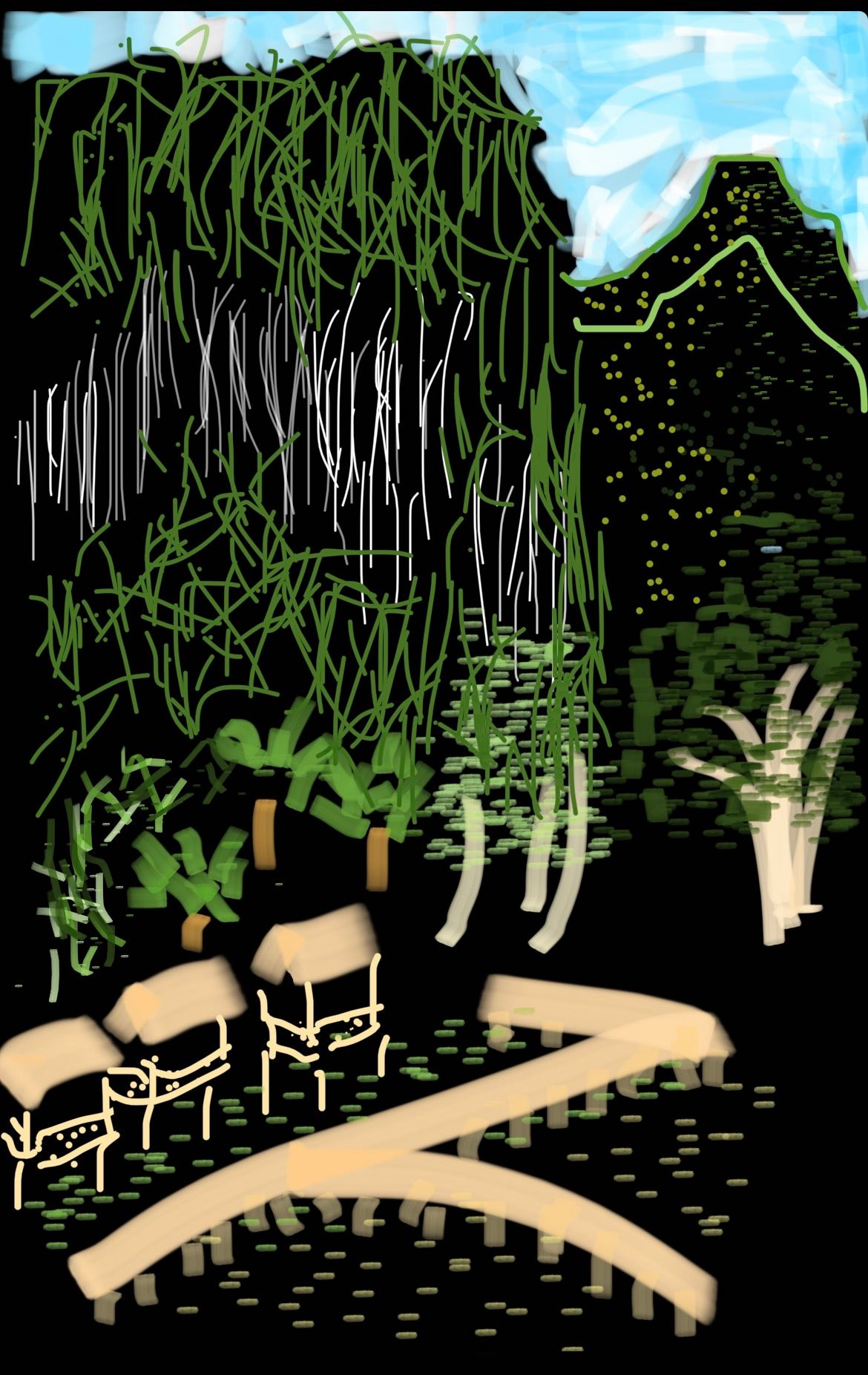 Could I maybe use that same digital pencil to draw up this scene with any degree of success? Why not give it a shot? I had time. A bed of fallen needles perched on a flat spot between a couple of pine trees overhead looked like a perfect spot to open up my Notes app and give it a test drive.