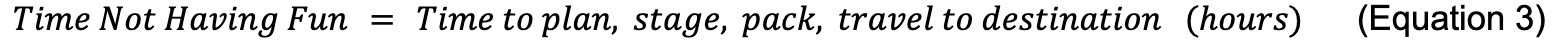 Back to the derby for some applied math. For Zion, we were probably getting close to 44 hours of Fuss, which included all the customary round trip factors in Equation 3. For this trip, four hours of sleep per night would count as Time Not Having Fun because slumbering was just going to get in the way of our main objective.